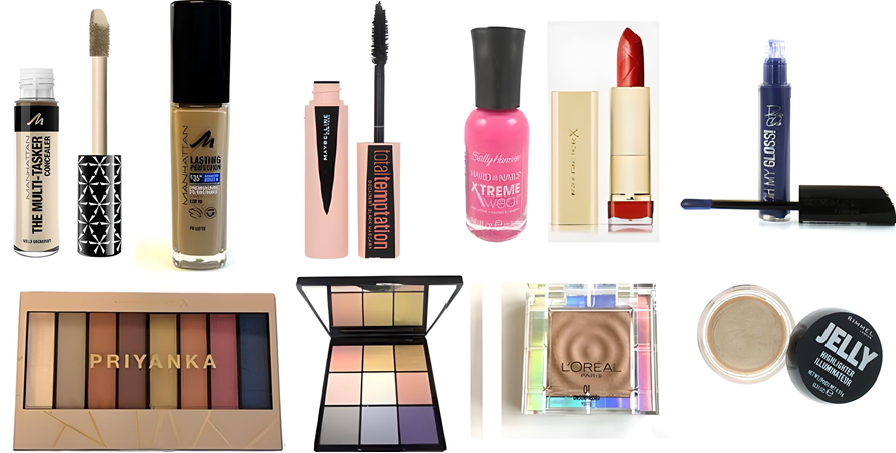 Foundation, Mascara, Eyeshadow, Concealer, Lipgloss, Blusher, Nail Polish, Lipstick, Eyebrow